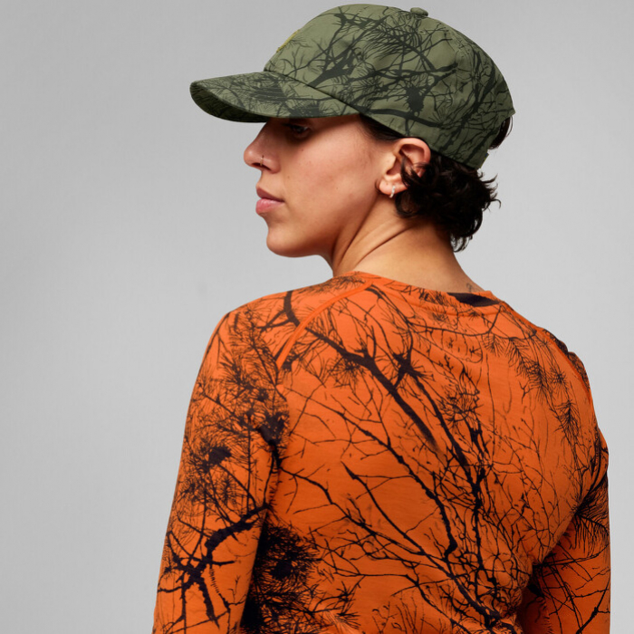 A sapka könnyű és strapabíró G-1000 Silent Eco anyagból készült. Megvédi a fejét és a szemét a közvetlen napsütéstől. A mintának köszönhetően beleolvad a környezetbe. A méretet fém csattal állíthatja be.