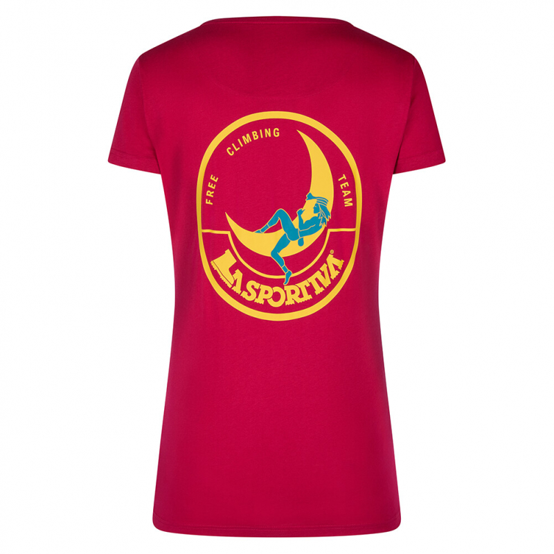 A La Sportiva Climbing on the Moon T-Shirt Women női póló organikus pamutból készült, amely puha és légáteresztő, így biztosítja a kényelmet viselés közben. A kényelmes szabás rövid ujjakkal és kerek nyakkivágással kellemesen illeszkedik az alakhoz. A mászós mintázat stílusos megjelenést kölcsönöz a pólónak, amely kiemeli a mászás iránti szenvedélyedet.