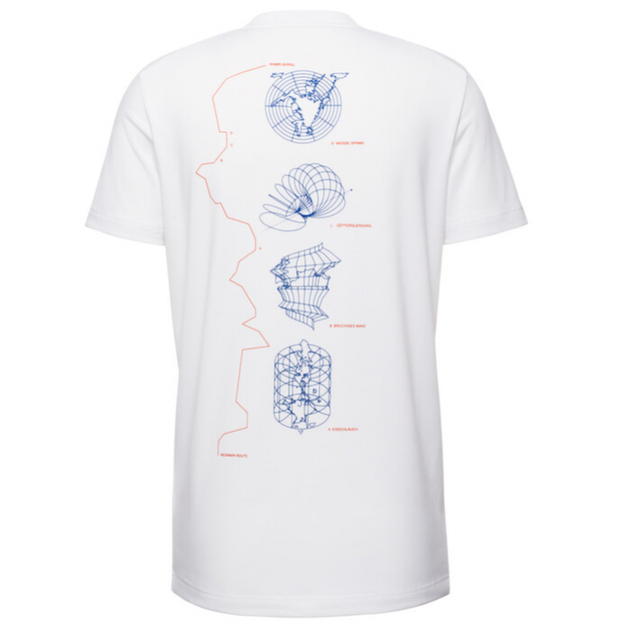 A póló rövid ujjú és kerek nyakkivágású, ami kényelmes és természetes szabást kínál. Az eltolódott vállvarrások biztosítják, hogy semmi se akadályozza, még hátizsák viselésekor sem. Érdekes részlet a Heckmair útvonal által inspirált grafika, amelyet először Anderl Heckmair hódított meg.